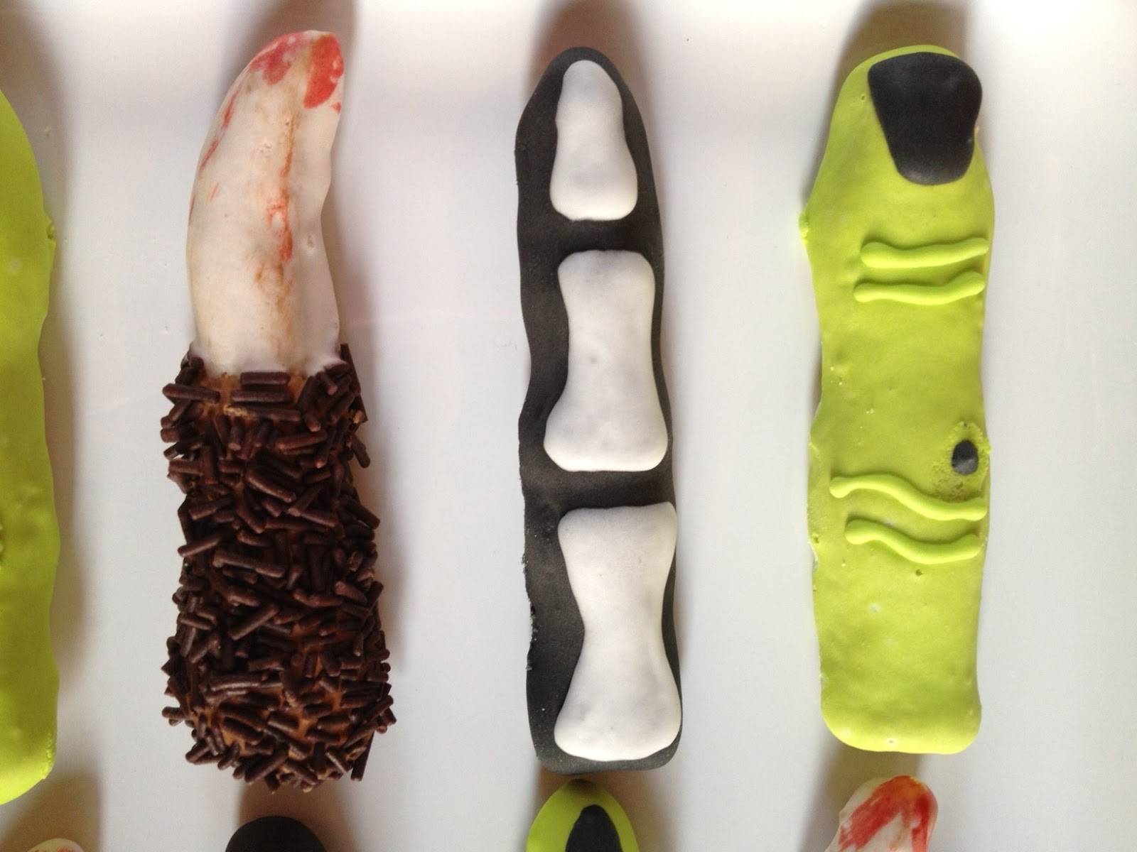 I first thinned out the colored icing just a little so I could pour it over the fingers (on a cookie sheet.) For the hairy monster I put sprinkles over it before it dried. Once they were dry I added the details. For the hairy one I used a paint brush to add red and brown to the white nail.
