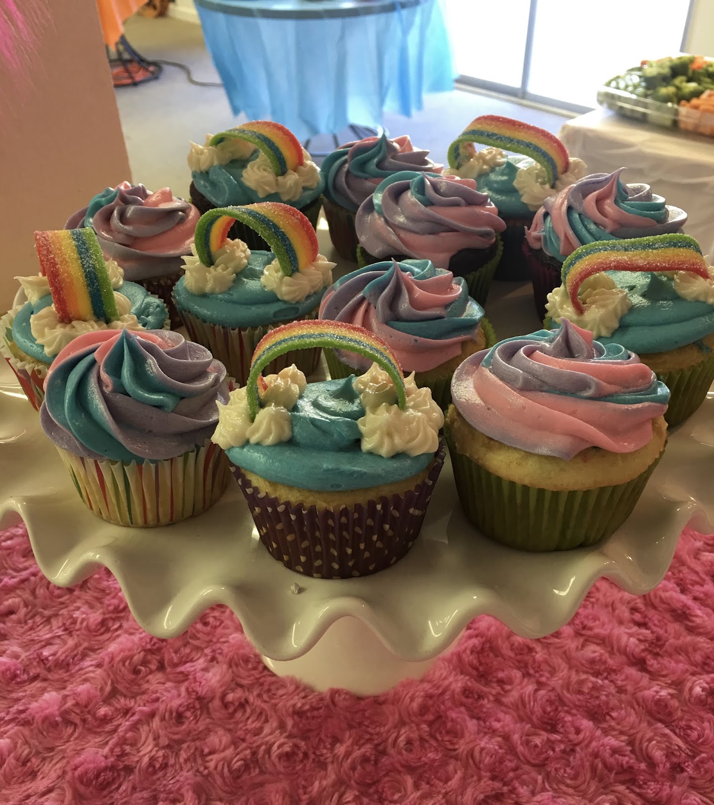 We colored the frosting, purple, pink and blue. We added the 3 colors to a piping bag being careful to keep each color on its own side of the bag and then squeezed it out until we saw 3 colors. We used a 1M tip to swirl onto the cupcakes. For the rainbows we used the blue frosting as the base, we cut a slit into the cupcake where the rainbow candy will go and then gently push it into the cupcake. They don't always stay in an arch but that was ok with us. Then you pipe on the white clouds using a small star tip. You could use mini marshmallows as well.
